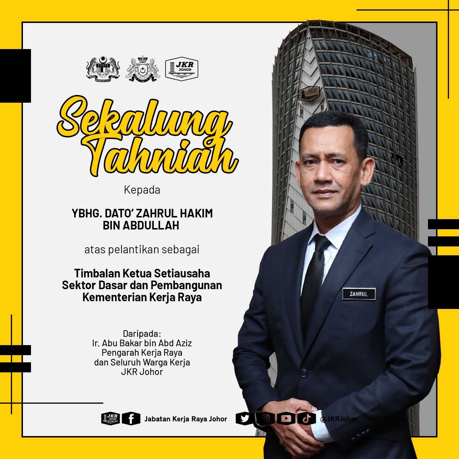 Jkr Johor On Twitter Tahniah Kepada Ybhg Dato Zahrul Hakim Bin Abdullah Atas Pelantikan Sebagai Timbalan Ketua Setiausaha Sektor Dasar Dan Pembangunan Kementerian Kerja Raya Malaysia Semoga Terus Cemerlang Selamat Menjalankan Tugas